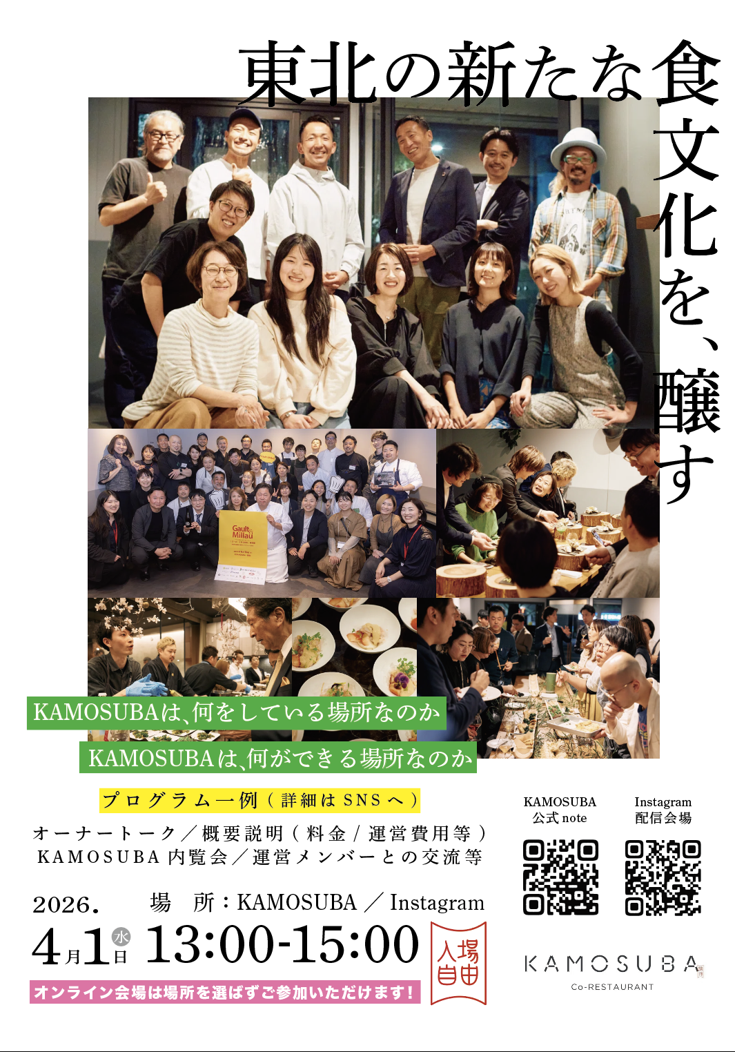 宮城県仙台市から、東北の新たな食文化を醸すCo-restaurant(コ・レストラン)『KAMOSUBA(カモスバ/醸場)』。