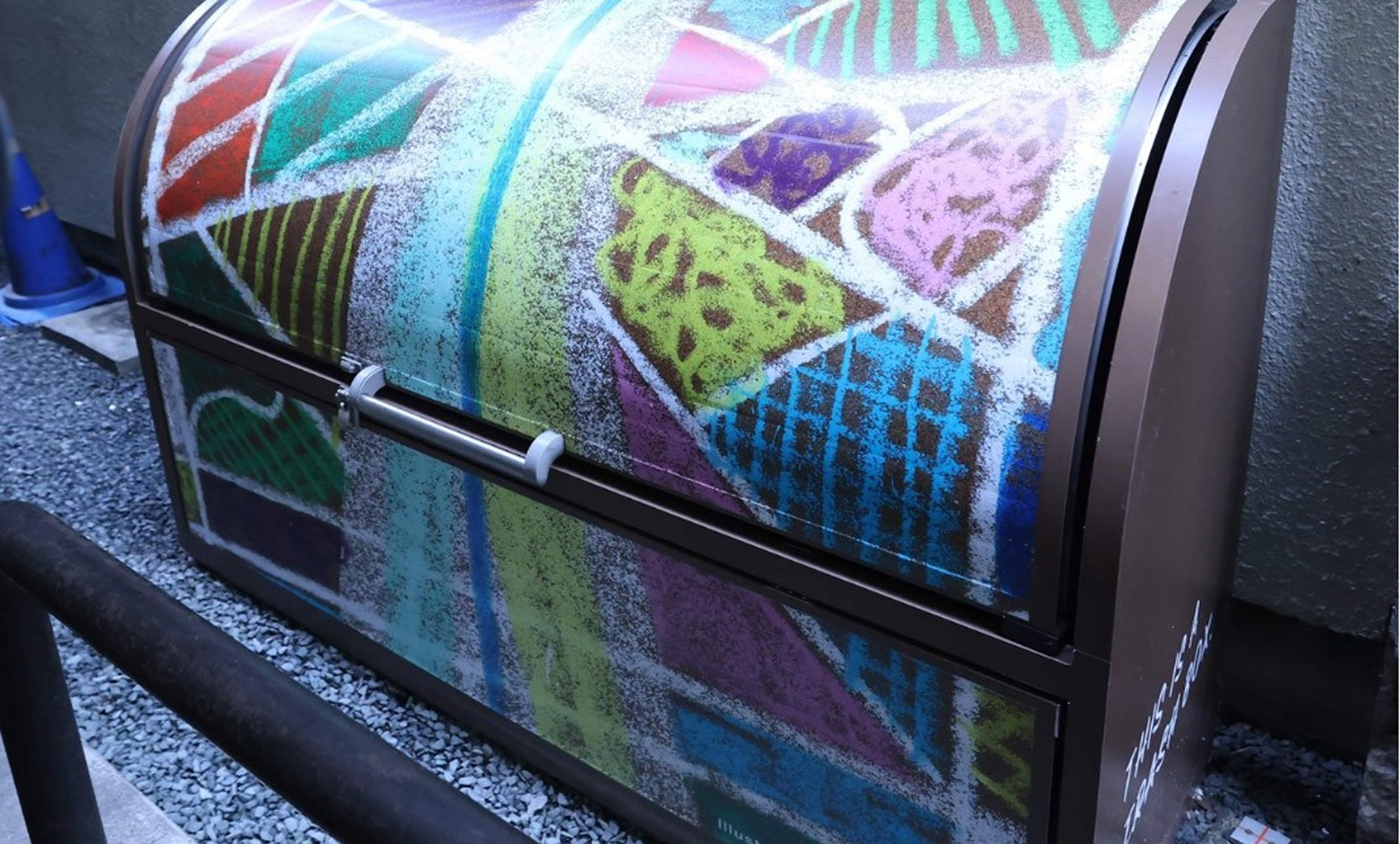 ごみ箱のメインビジュアルは、チャレンジドジャパンで就労支援を受けている方々に描いていただきました。