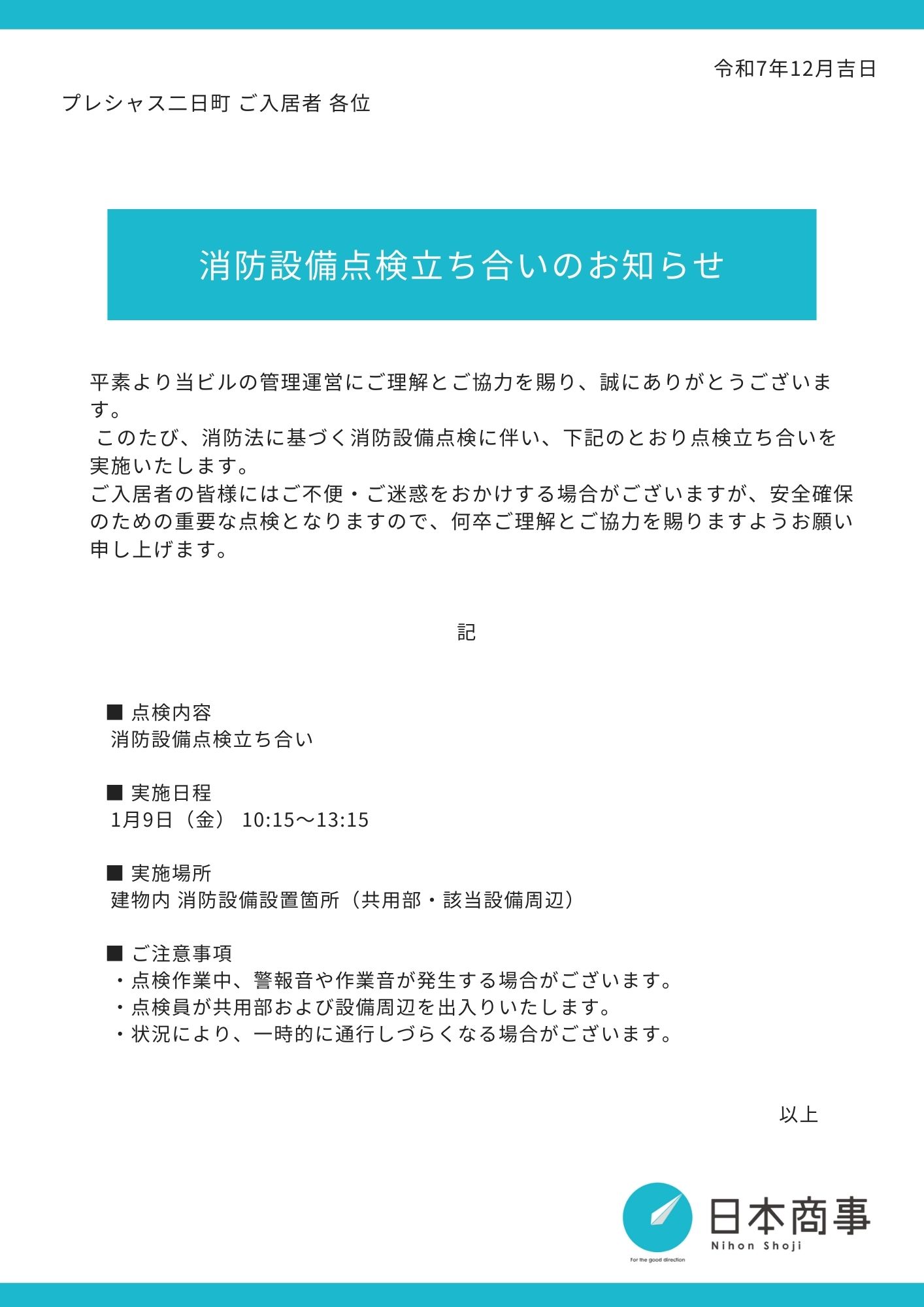プレシャス二日町|0109_消防設備点検のお知らせ 2025.12.26 TOP NEWS プレシャス二日町|0109_消防設備点検のお知らせ 平素は当ビルの管理にご協力いただきまして誠にありがとうございます。 このたび、下記の日程で消防設備点検を実施させていただきます。内容は以下の通りです。