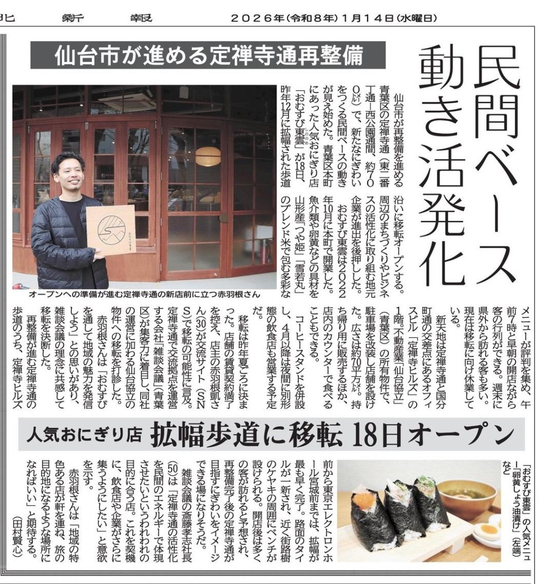 このたび、1/14発行の河北新報 朝刊にて、当社所有物件「定禅寺ヒルズ1階」にオープンする おむすび専門店「おむすび東雲」 が紹介されました。