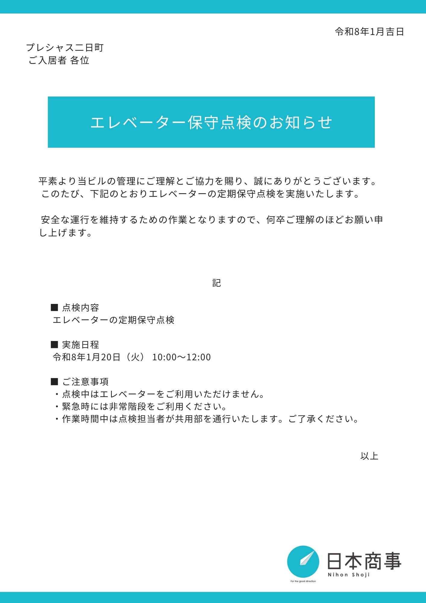 プレシャス二日町|0120_エレベーター点検のお知らせ