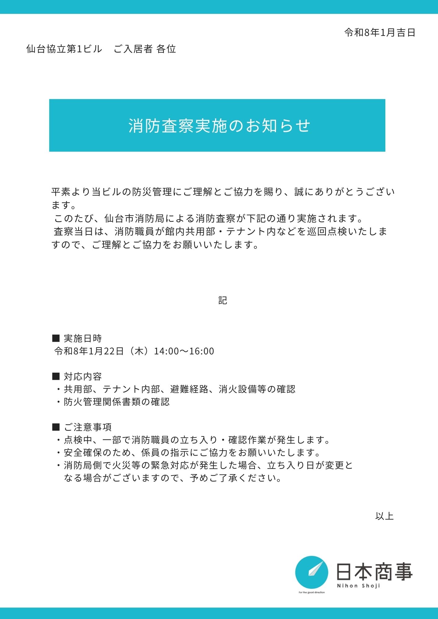 仙台協立第1ビル|0122_消防査察のお知らせ 2026.01.16 TOP NEWS 仙台協立第1ビル|0122_消防査察のお知らせ 平素は当ビルの管理にご協力いただきまして誠にありがとうございます。 このたび、下記の日程で消防査察を実施させていただきます。内容は以下の通りです。