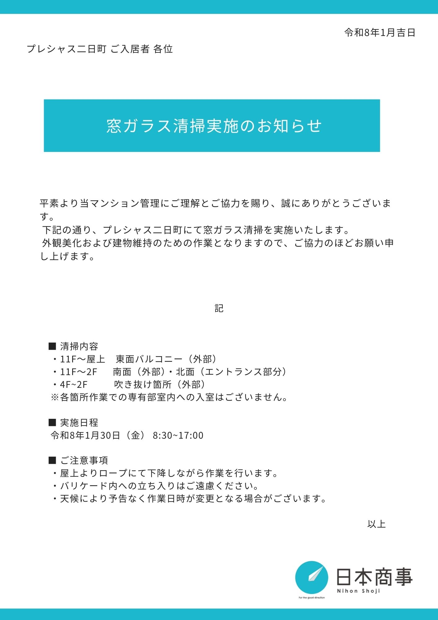 プレシャス二日町|0130_窓ガラス清掃のお知らせ 2026.01.23 TOP NEWS プレシャス二日町|0130_窓ガラス清掃のお知らせ 平素は当ビルの管理にご協力いただきまして誠にありがとうございます。 このたび、下記の日程で窓ガラス清掃を実施させていただきます。内容は以下の通りです。