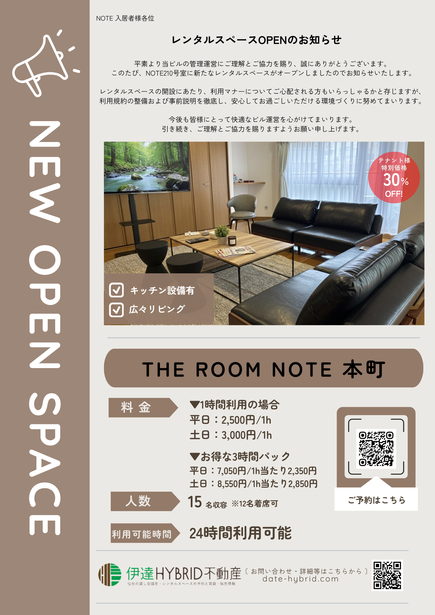 このたび、2月13日よりNOTE210号室に新たなレンタルスペースがオープンいたします。