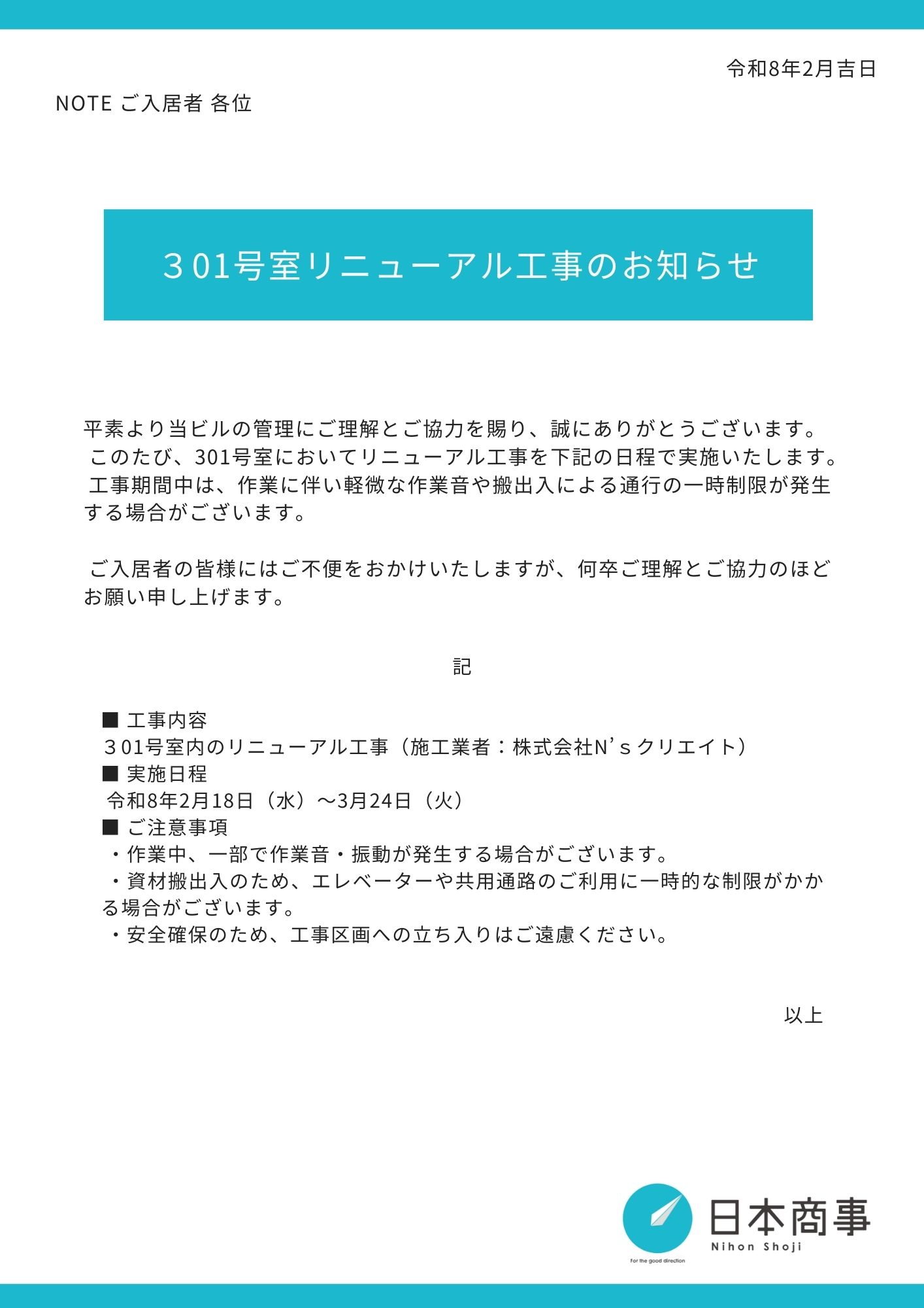 NOTE|0218_301号室リニューアル工事のお知らせ 2026.02.16 TOP NEWS NOTE|0218_301号室リニューアル工事のお知らせ 平素は当ビルの管理にご協力いただきまして誠にありがとうございます。このたび、下記の日程で301号室リニューアル工事を実施させていただきます。 内容は以下の通りです。