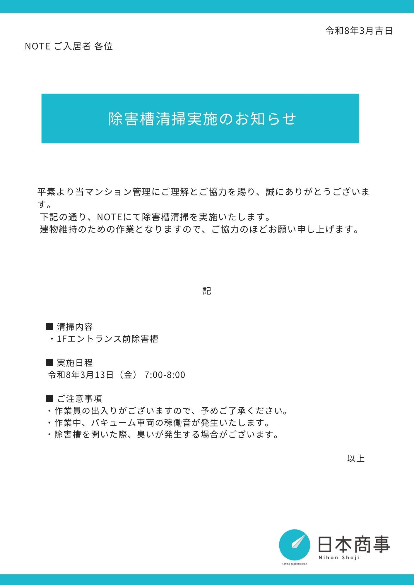 NOTE|0313_除害槽清掃のお知らせ 2026.03.06 TOP NEWS NOTE|0313_除害槽清掃のお知らせ 平素は当ビルの管理にご協力いただきまして誠にありがとうございます。このたび、下記の日程で【除害槽清掃】を実施させていただきます。 内容は以下の通りです。