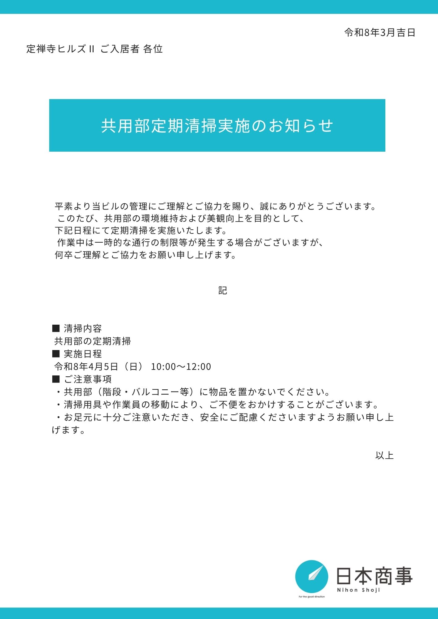 定禅寺ヒルズⅡ|0405_共用部定期清掃のお知らせ