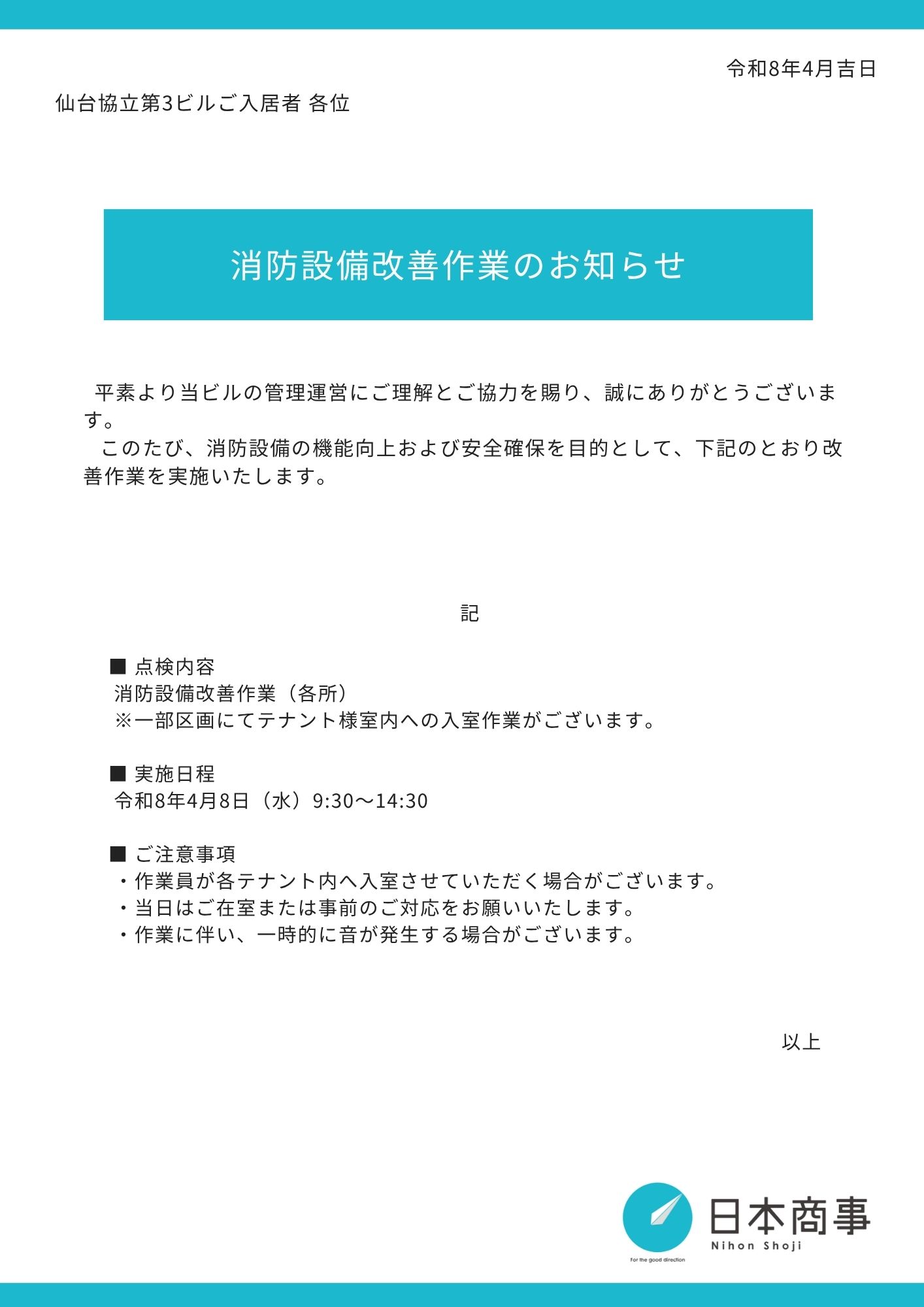 仙台協立第3ビル|0408_消防設備改善作業のお知らせ 2026.04.03 TOP NEWS 仙台協立第3ビル|0408_消防設備改善作業のお知らせ 平素は当ビルの管理にご協力いただきまして誠にありがとうございます。このたび、下記の日程で【消防設備改善作業】を実施させていただきます。 内容は以下の通りです。
