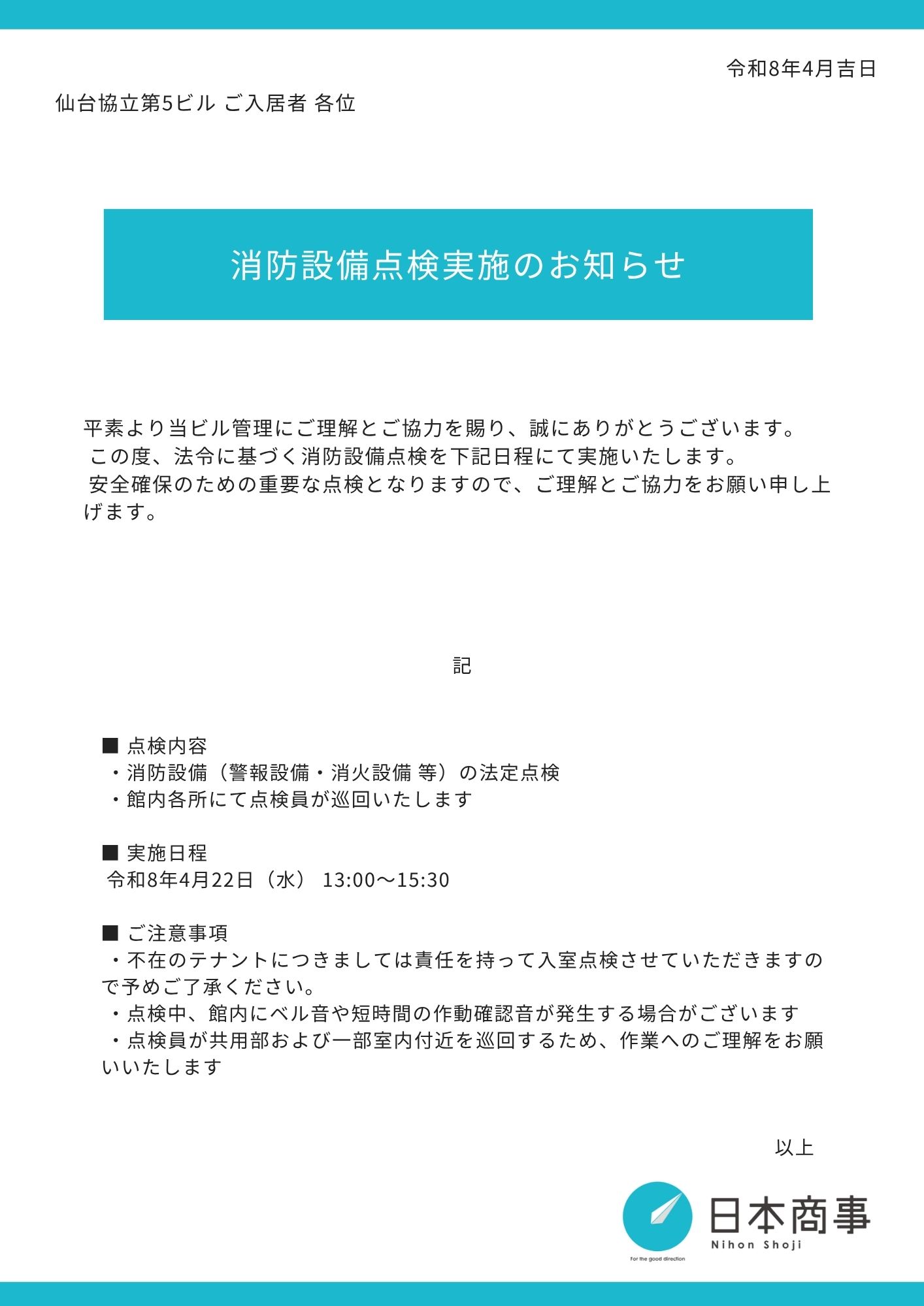 仙台協立第5ビル|0422_消防設備点検のお知らせ 2026.04.20 TOP NEWS 仙台協立第5ビル|0422_消防設備点検のお知らせ 平素は当ビルの管理にご協力いただきまして誠にありがとうございます。 このたび、下記の日程で消防設備点検を実施させていただきます。 内容は以下の通りです。